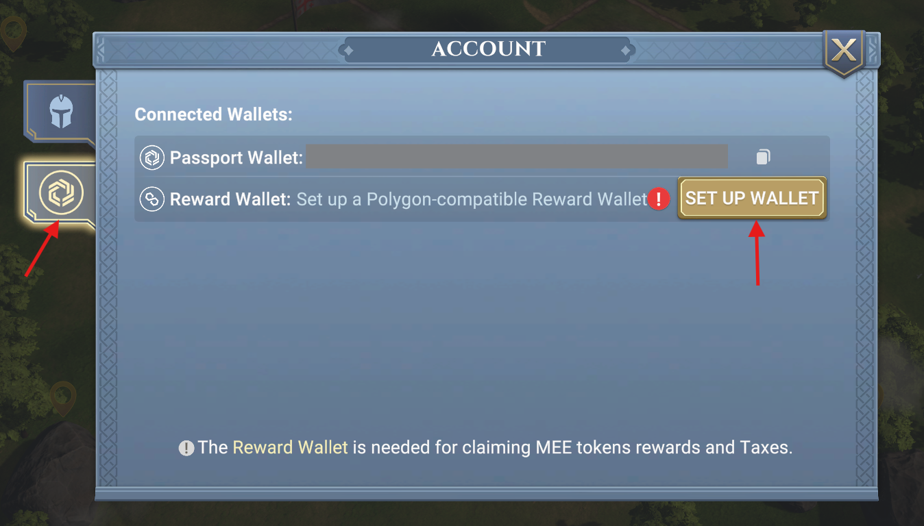 Here, you can click on the IMX logo to access your Account page, where you can view your connected wallets. If you do not have a reward wallet set up, you will be given the option to connect one in order to claim MEE token rewards and taxes.